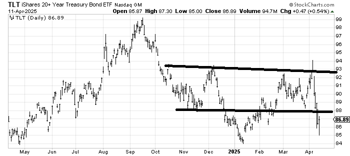 So much for my thinking TLT would trade between 93 and 88 for a time. Last week it traded over 93 and then went plop, then it traded under 88 and is trying to get back over 88. I think it can get back over 88, and if I am correct, I would continue to think we’re in that range for the time being. If it can’t get over 88 then the stock market is not going to like it.