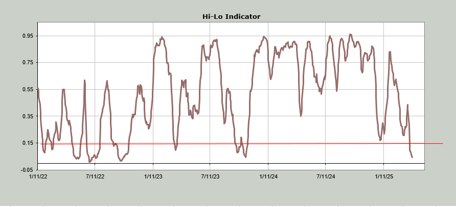 The Hi-Lo Indicator for both the NYSE and Nasdaq sits in oversold territory at .05
