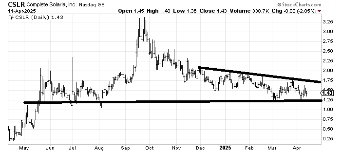 I’m not sure this is the environment for small-cap stocks that trade at a buck and that is what Complete Solaria CSLR is. The stock is acting sold out, so as long as it holds over 1.25, it gets a chance to prove itself. In a different market environment, I’d warm up to this type of chart, even if it looks early.