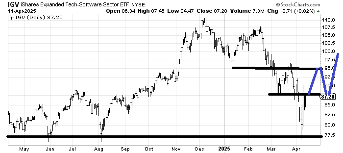 The ratio of the SOX to Nasdaq ticked back up ever so slightly on Friday. I’ll continue to monitor that for signs of weakness or strength. In the meantime, let’s also focus on software, the chart of IGV has me intrigued because it did not make a lower low and it has scurried right back to first resistance already. I now wonder if it can map out as I have drawn in blue. It just seems to act differently than most other technology right now.