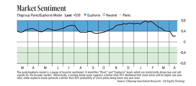 Speaking of emotions, the Citi Panic/Euphoria Model had quite a move last week. It didn’t get to Panic, but for the first time in more than a year it fell out of Euphoria in a significant way.
