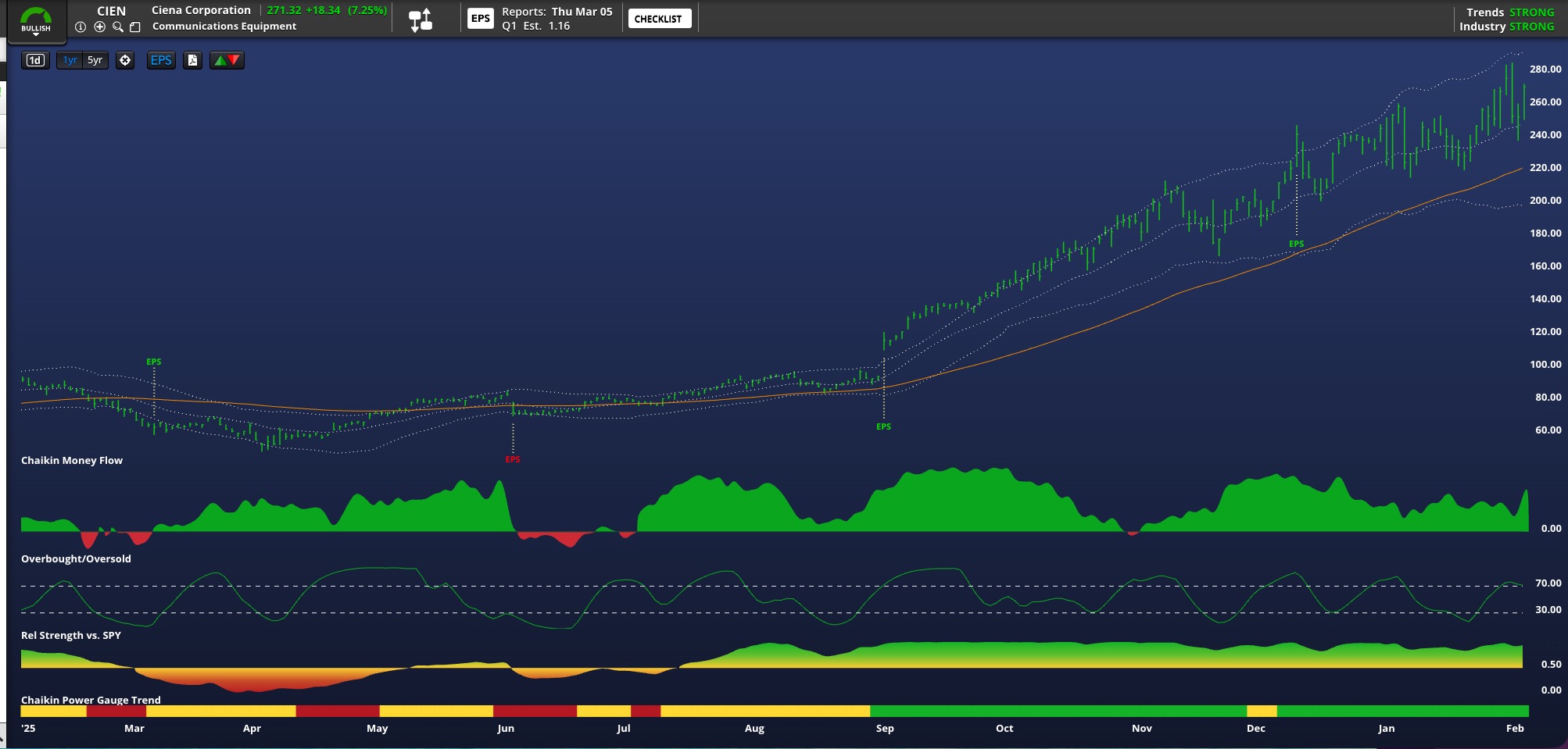 The technical picture looks good for Ciena. Notice on this Chaikin Analytics version the strong price chart, positive money flow, solid relative strength and the overall bullish rating on the power gauge (bottom).