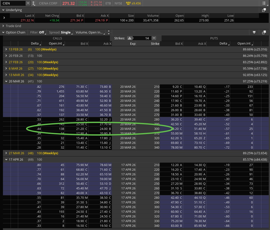 Back to Ciena, which is a $270 stock and has pricey options.