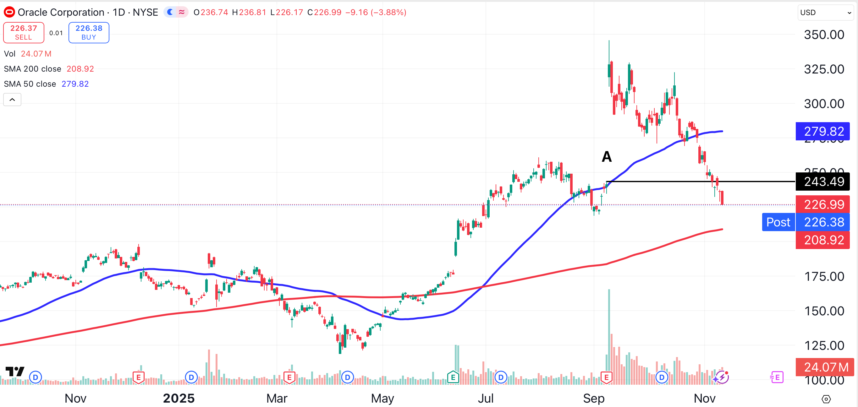 Oracle’s chart provides a good explanation as to why buying at the highs can be risky. Oracle has broken below its 50-day moving average (blue line), and appears to be headed for its 200-day moving average (red), currently located near $209.