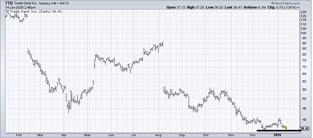 If Trade Desk (TTD) can start holding and moving sideways, then I might just warm up to it. But I would need a better pattern to set up for me to think we can get more than a pop right now.
