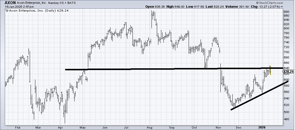 At least Axon (AXON) met its downside target when it got into that 500 area. It’s possible it fills that gap overhead (700) but I’m inclined to think there is more work to be done before this can rally much better. I’m inclined to call it a hold here because it feels like it’s working on it.