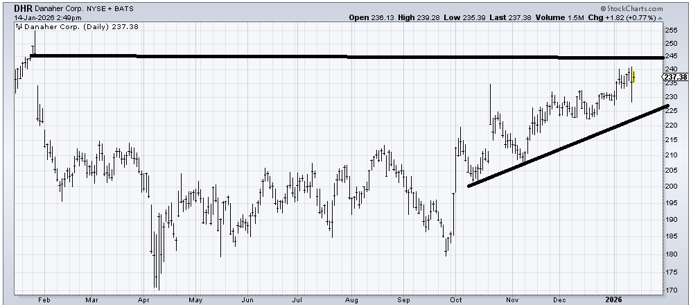 I would be willing to give Danaher (DHR) a chance to fill that gap at 245 as long as it stays over the uptrend line. There is a measured target in the 240 to 245 area so it’s getting to the point in time that it is overdue a correction.