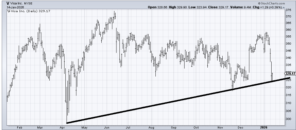 The question is if Visa (V) is worth a shot for a trade here. It is certainly getting oversold and is at support. If it can hang on for another day or so and doesn’t break 325-ish, then sure, a trade.