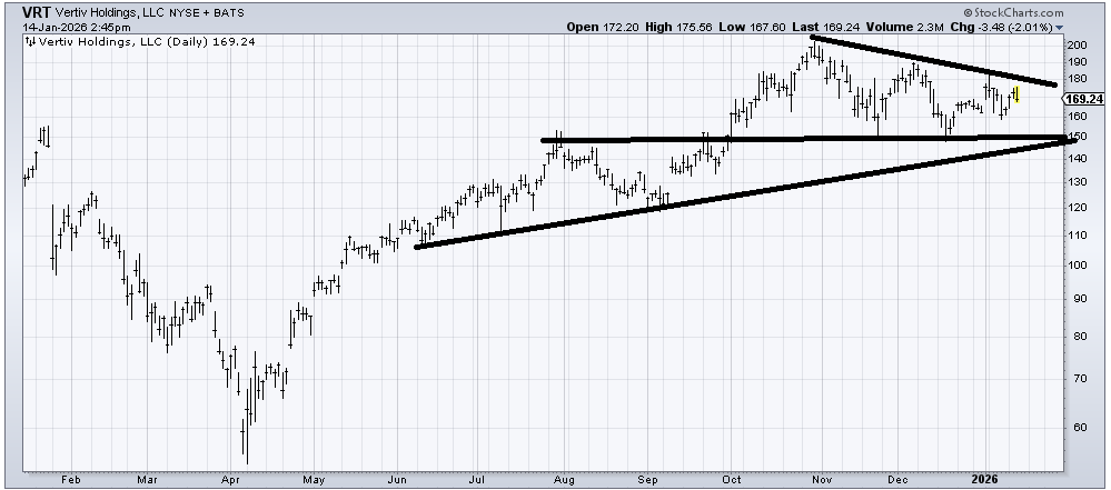 Vertiv (VRT) looks trapped to me. I’m not sure it has the oomph to break out on the upside and if it falls toward that 150 support it probably bounced, at least the first trip down there.