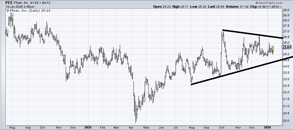 I was asked if I still like Pfizer (PFE) and the answer is yes. With a base like that, how can I say no to this chart?! But it is frustrating. Yet I am sticking with it for now. If it cracks under 24 I might rethink my view.