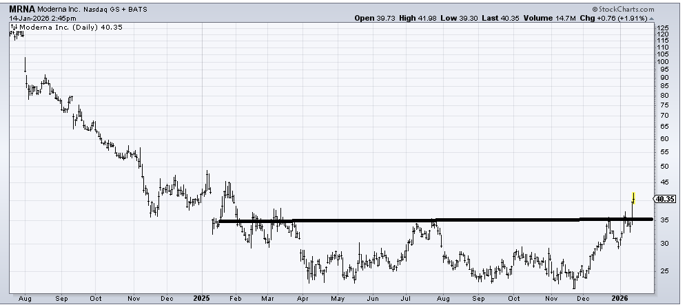 I still can’t believe Moderna (MRNA) rallied so well because, as I have said every time I have liked it, it has managed to disappoint me. There is resistance in that 45 to 50 area and there is a measured target there. A gradual pullback toward 35 would be buyable because your stop would be rather close around 33.