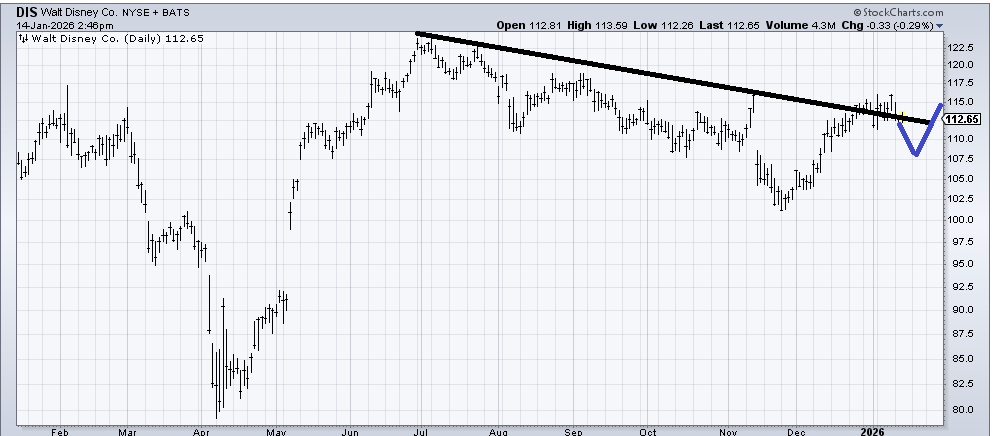 Did Disney (DIS) have a failed breakout or is my line not thick enough? I don’t know the answer yet but I do know I would love to see the chart come back into that 108 to 110 area, hold and then rally. That would give me some confidence that the chart should start working better.
