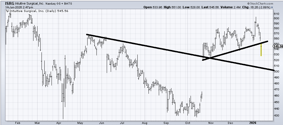I’ll give Intuitive Surgical (ISRG) a day or so to recapture that line around 550 to 560 but a failure to do that would have me thinking the stock is vulnerable to more downside (no target).