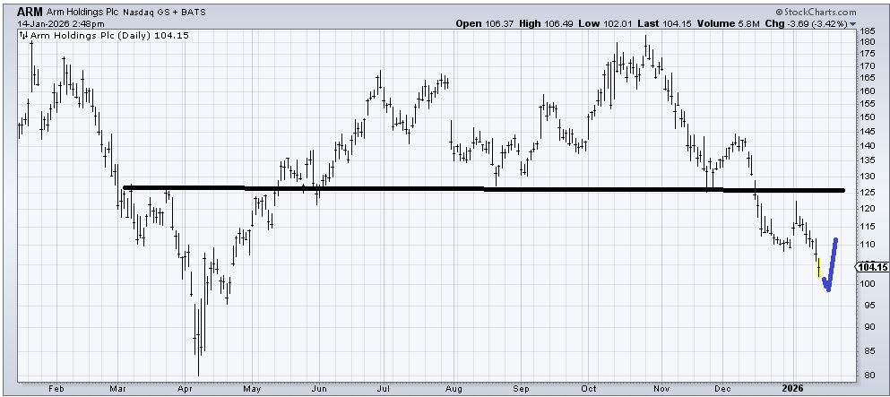 Arm Holdings (ARM) has a measured target near that April low. I don’t think it gets there in a straight line. For example, in this 100 to 102 area, it fills that gap from April so should bounce from there. But if it then cannot get over 110 I think it would come down again. That’s the key.