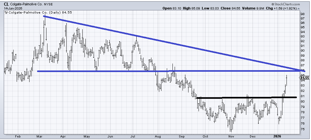 We have had a terrific trade in Colgate (CL) over the last month or so. That little bottom measures to 86 to 87 and there is resistance at 86 (blue lines). I would not argue too loudly if you wanted to take some profits here, although my guess is dips get bought for the time being.
