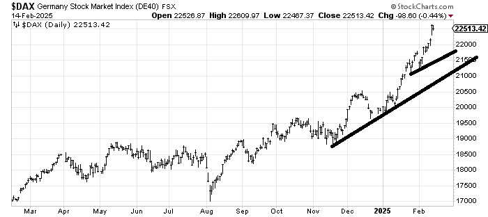We may as well start with the DAX. It looks overextended to me but hasn’t done anything wrong. A pullback into that 21250-21500 area ought to find support.