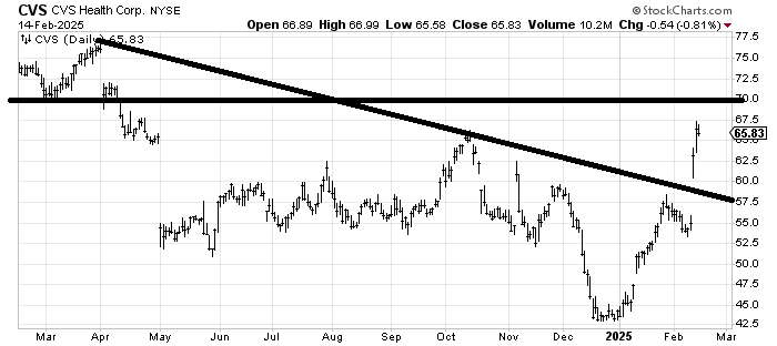 CVS CVS managed to jump over the downtrend line on earnings and ran right into resistance. A pullback toward that line would be a good shakeout. Longer term this ought to make its way toward $70-75 ($70 is resistance while $75 is a measured target).