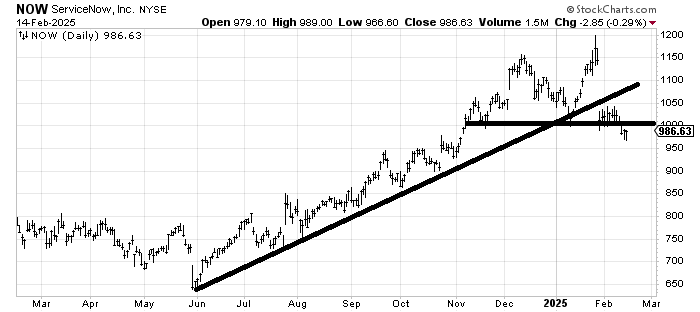 ServiceNow NOW is a tiny bit oversold down here. I would expect $1,000-ish to be resistance. And this is key: If it can recapture $1,000 readily and make its way to $1,050 then this breakdown looks false; if it can’t it ultimately measures to $850-ish.