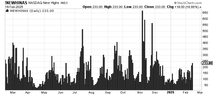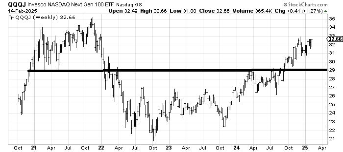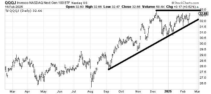 I have liked the Junior QQQs (they trade thinly but they give us a great idea of where the action is, which is smaller tech stocks, not mega ones). The chart of Invesco NASDAQ Next Gen 100 ETF QQQJ would be one to put on the watch list. That high at $33 from December has been acting as resistance. Can it break out now?