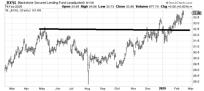 Blackstone Secured Lending Fund BXSL has a big juicy dividend and recently broke out. It measures to $35-ish.