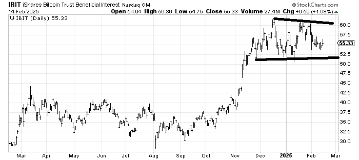 iShares Bitcoin Trust IBIT, an ETF to be long Bitcoin, hasn’t done a thing in months. I’m going to say it remains in a range of $50-60 and unless/until it breaks one way or the other, it’s a coin toss.