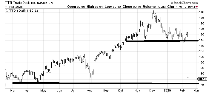 That breakdown in The Trade Desk TTD measured to $90 and it blew past it. There is support around $75-77 so I would expect a short-term bounce from there but that’s the best I see for now.