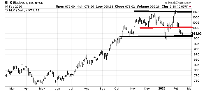 There is a lot going on with the chart of BlackRock BLK. It broke a solid uptrend line back in early January (not shown) and then snapped right back (you see why I like to allow for false breaks — in both directions!) but now it is retesting that gap and the prior lows. If you wanted to take a stab here then the risk/reward isn’t bad because under $950 and you’re wrong. However, there is now so much resistance all the way back up that you must watch $1,000 closely. Failure to get back over and the next time down it would be likely to break.