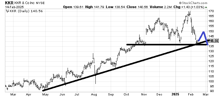 KKR KKR is a similar picture to BLK but this one has not broken the uptrend line even though it has made a lower low (than January). My best guess is it bounces from here and comes back down. My question is whether or not it breaks $135 on the next trip down. The blue lines are meant to show the pattern I expect, not the exact price levels. If it maps out like this it will look like a head-and-shoulders top.