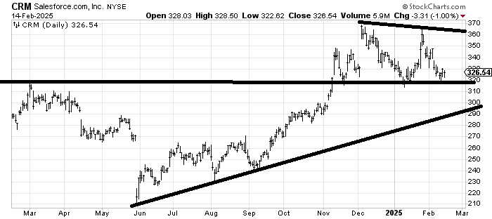 When we last looked at Salesforce CRM several weeks ago I drew (in blue) up, then down, then up. We got the up, we got the down, but so far the up has been worthless. If it breaks under $320 now I think it is going to tag that lower line. Earnings are next week.