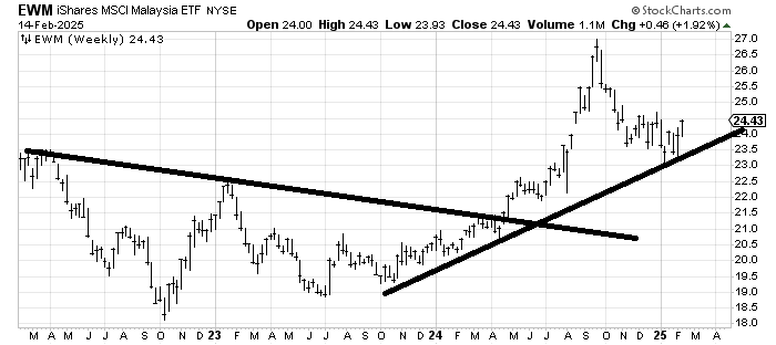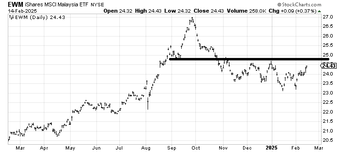Last year in January I recommended iShares MSCI Malaysia EWM, an ETF to be long Malaysia. It had a terrific run through September. It has since had quite a correction and unlike many of the other non-U.S. charts we looked at above it hasn’t had a big run in 2025. I don’t have a strong view on the near term but that looks like a chart that is rounding under and as long as it stays over $23 is a good chart.