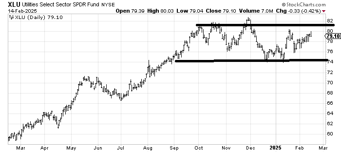 Or maybe we can watch the Utes. Utilities Select Sector SPDR Fund XLU has also been in a wide range since the fall. Bonds have taken out the mid-January high (low in rates) but the XLU got up there Friday and said, nope.