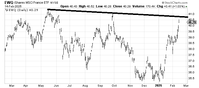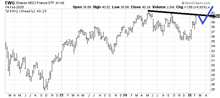 Back in late November, as our markets were topping I said look at iShares MSCI France ETF EWQ, an ETF to be long France. Framce was having all sorts of issues, new elections, no confidence votes, Europe slowing down, etc. Yet it looked to me as if this chart was a buy because it was no longer going down on bad news. I think we can all agree that the U.S. markets don’t look like that over the last six weeks, even though they are both kissing the old highs.