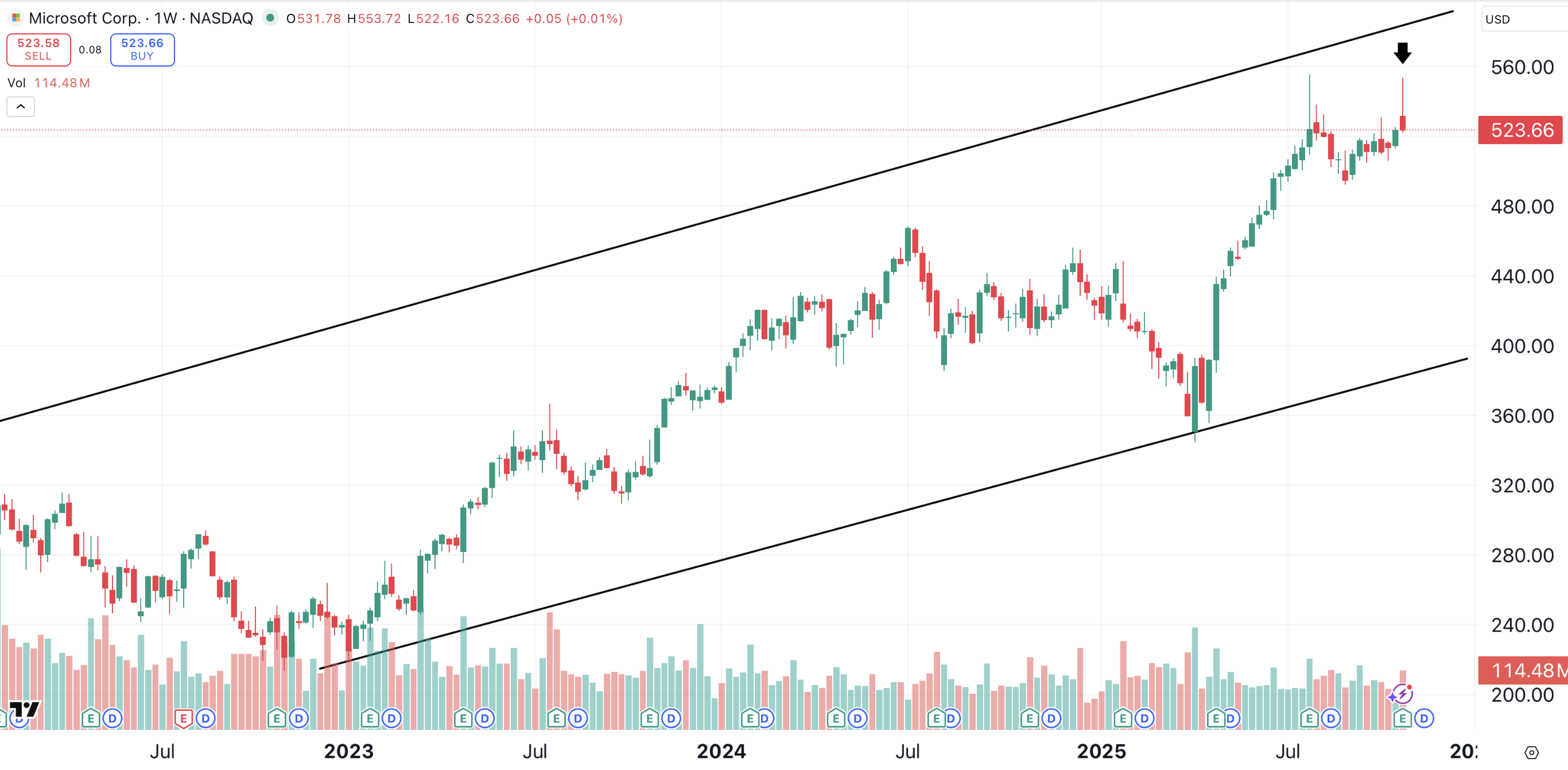 I’d be a buyer of Microsoft near $500, and would hold it as long as it remains within its weekly bullish channel (parallel lines). The stock’s bullish trend line currently comes in just below $400, but that line is rising every day. If I were a long-term holder of Microsoft, I’d keep it as long as the stock maintains its position above the trend line.