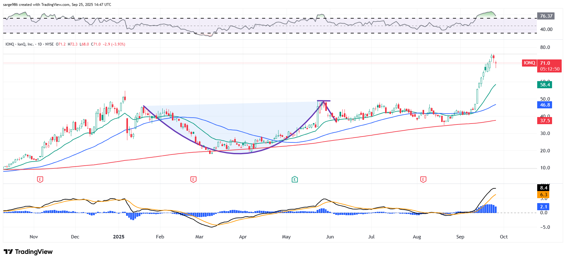 IonQ is showing the same kind of topping behavior, but with still strong but weaker indicators. Take a look at this:​