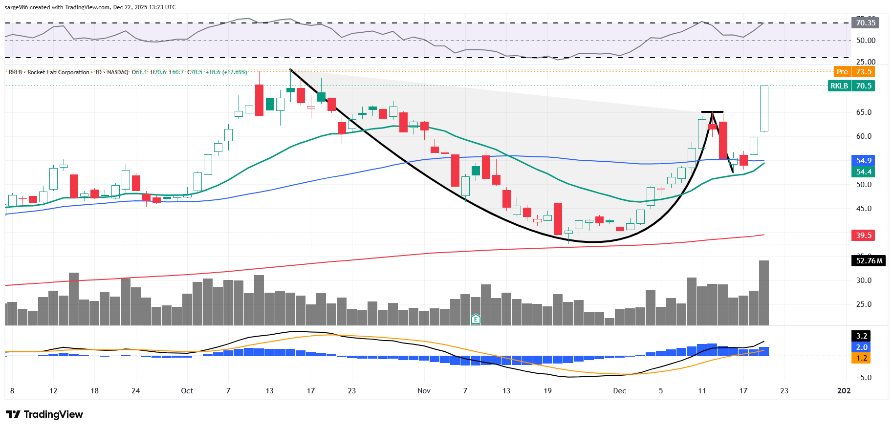 Well, lucky me, I had no internet for part of last week and had to take my Florida office apart (again) and move it somewhere else in the area, where I combined it with my Long Island office. I was unable to trade or even work on my portfolios for days. This morning, RKLB is trading with a $73 handle after closing at $70.52 on Friday. RKLB was up more than 17% on Friday and at this morning's last sale is up 95.6% over the past month. Yowza! We now have a much more bullish technical pattern to look at, which I'll get to in a minute.