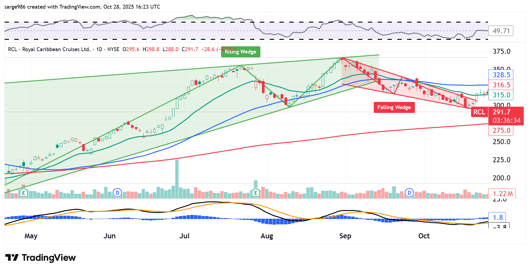 Quite honestly, I do not see RCL as a potential investment with a balance sheet like that. However, this stock could be a vehicle for trade. The stock sold off coming out of a rising wedge as might have been expected. Then, more recently, the shares tried to rally coming out of a falling wedge.