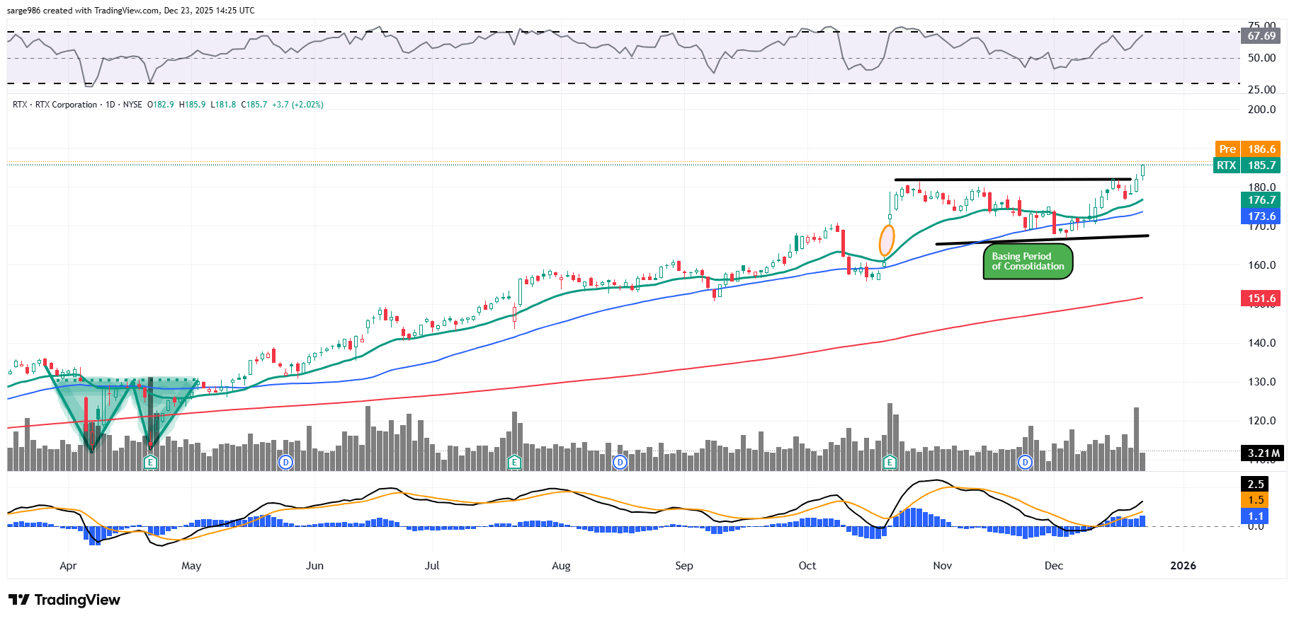 Readers will see that RTX went into a more than two-month basing period of consolidation late in 2025 after rallying sharply out of a double bottom pattern of bullish reversal this past April.