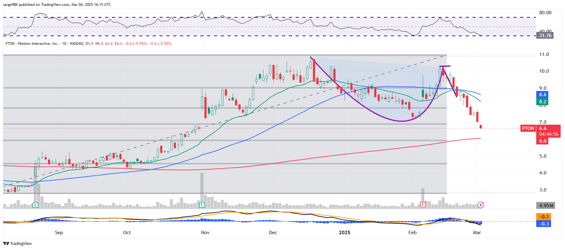 Readers will see in this chart of Peloton a cup-with-handle pattern with a $10.25 pivot. Well, the handle is now obviously not a handle at all.