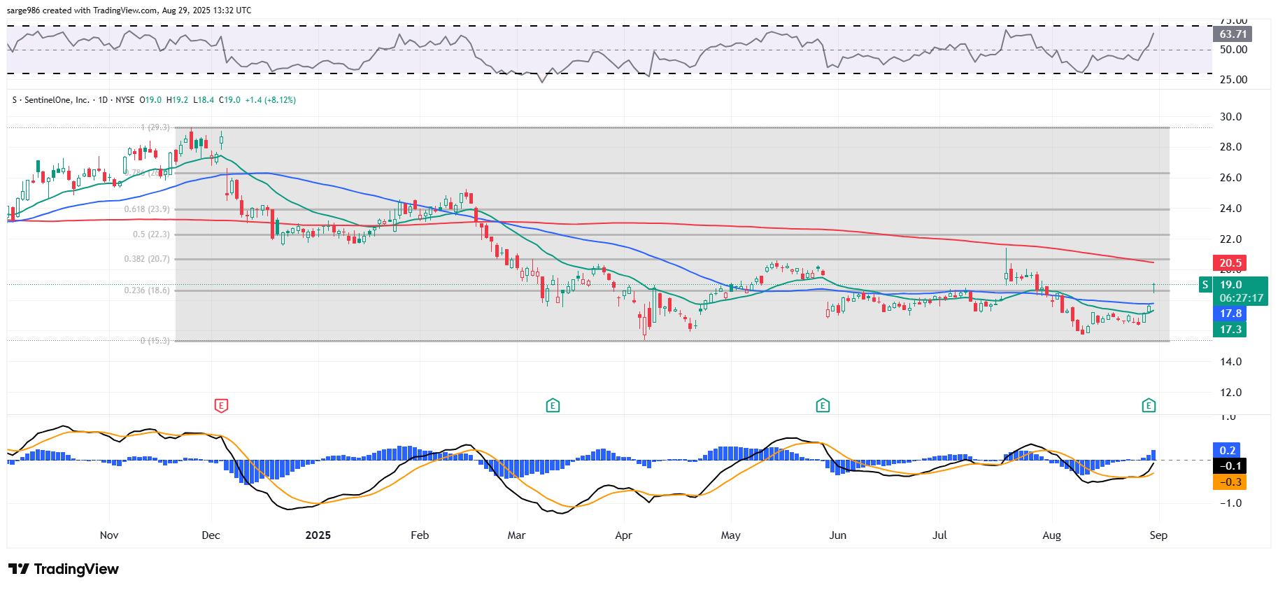 Readers will see that SentinelOne has developed a "flat base" or trading range that has lasted from early this past March into the present. The range spans from the lows of early April to the 38.2% Fibonacci retracement level of the November into April sell-off. The stock's 200-day simple moving average is running almost concurrently with that Fibonacci level. Now, that the 50-day SMA has been taken, this is the stock's not target, but next pivot point.
