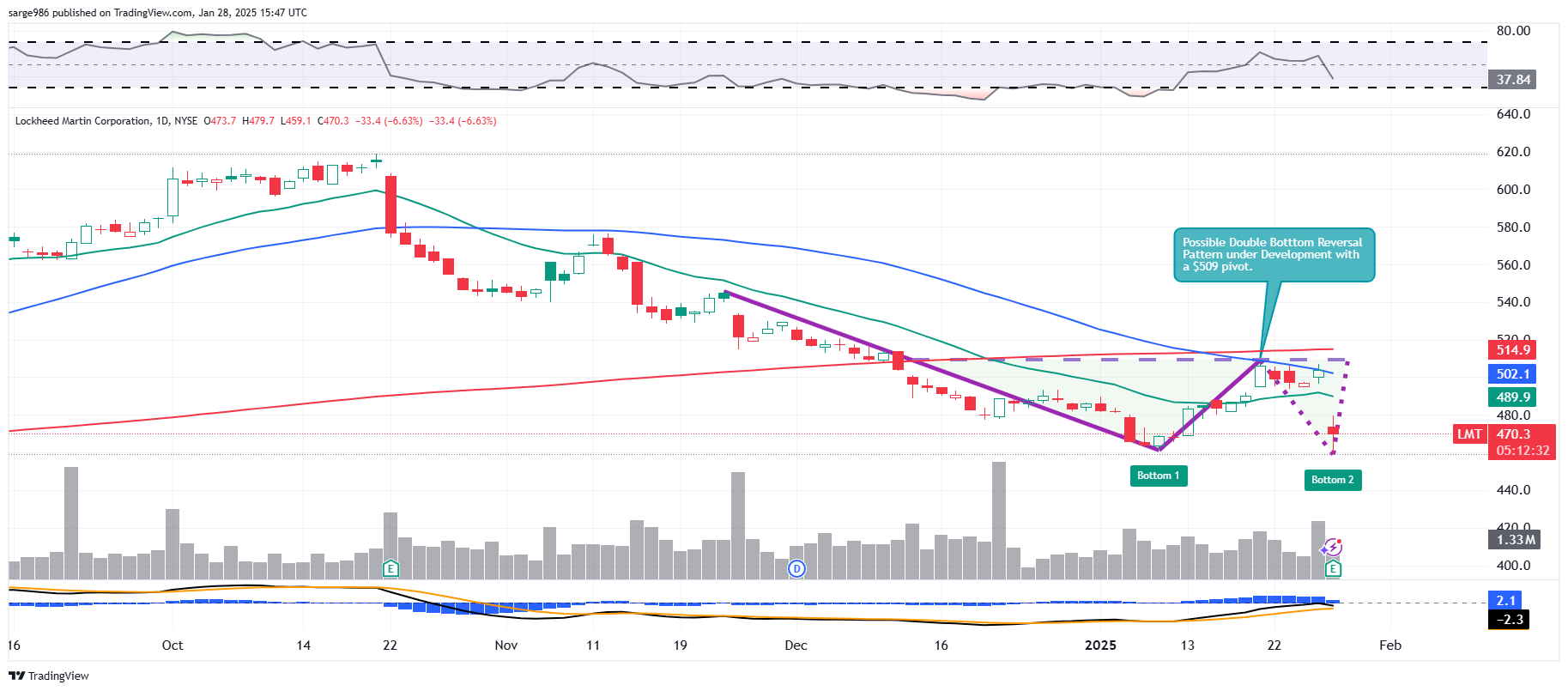 This one is tricky, because the market does not like the guidance, the losses incurred associated with classified programs or the firm's pension obligations. Relative strength is waning. The daily MACD is ebbing and is no longer bullishly postured. Actually, there's not a lot to like, but I'll probably buy some today. Why?