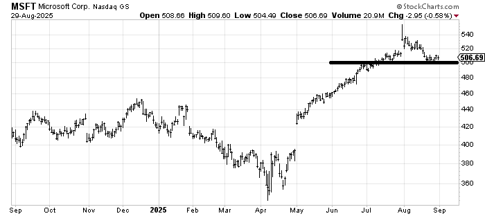 I don’t love that Microsoft MSFT more than filled its earnings gap, nor do I love that it pulled back over ten percent from that gap. But the stock is holding this 500 area, so as long as it can hold this area, this ought to turn into a correction and not much more. A break of this general support (500-ish) would have me rethinking that view.
