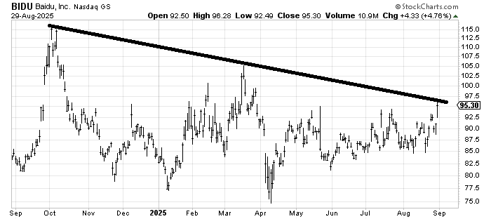 I think Baidu BIDU is working on a base. It also has resistance here and from that spike in March. I cannot decide if it will cross the line, run into that spike high and pull back, or if it will retreat and then make another (successful) run to get over the line. I would prefer the former over the latter.