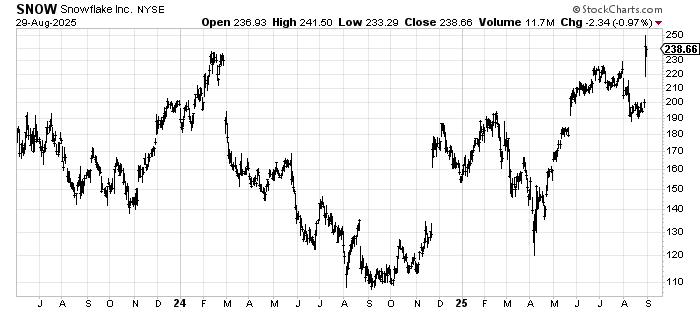 The first thing I need to address is the chart of Snowflake SNOW. When I recommended it a few weeks ago, I said I thought it was ‘just a trade’. I expected it would rally into resistance and come back down. I did not expect it would gap up over those summer highs and even challenge the early 2024 high. Yet that is exactly what it has done. There is a next measured target around 270 now. It’s hard to determine a stop because it would be so far away. In this market, I would opt to take a few profits up here just in case, since so many gaps up like this have not had a lot of follow-through.