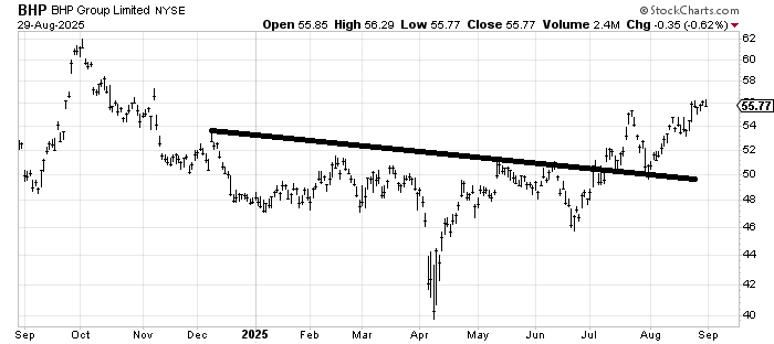 BHP BHP is an interesting chart because it formed a pattern I tend to like: breakout over a line and a retest of the line (see July). And that base measures to the 62 area, which is the high you see from nearly a year ago. Short term, it is tired, but it ought to work its way up there over time.