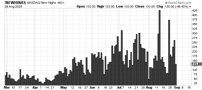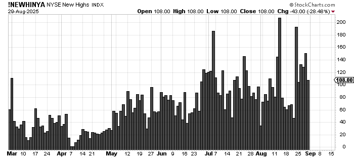 For all the hullabaloo, though, the number of stocks making new highs remains under the mid-August reading and still pretty pathetic. The charts are shown below.