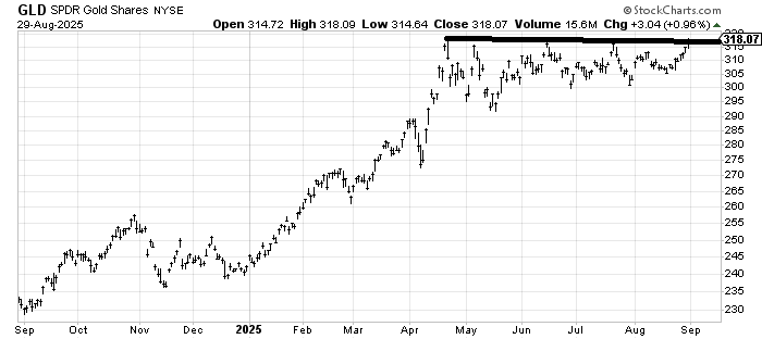 Next, I need to address GLD, an ETF to be long gold. I maintain that as long as GLD does not break under 300, it is okay. But now the test is if it can crack over 320 and hold it. It has tried to get over it four times since it first got there in April and has failed to do so. The DSI is currently 79, so there is room for it to do so. If it does, I believe the likely scenario would be a breakout with a quick run toward, say, 330, maybe even 340, with the DSI getting to the upper 80s, maybe even 90, and then we’d see it come back down again. In other words, the DSI gives it some room to rally but not a super long runway.
