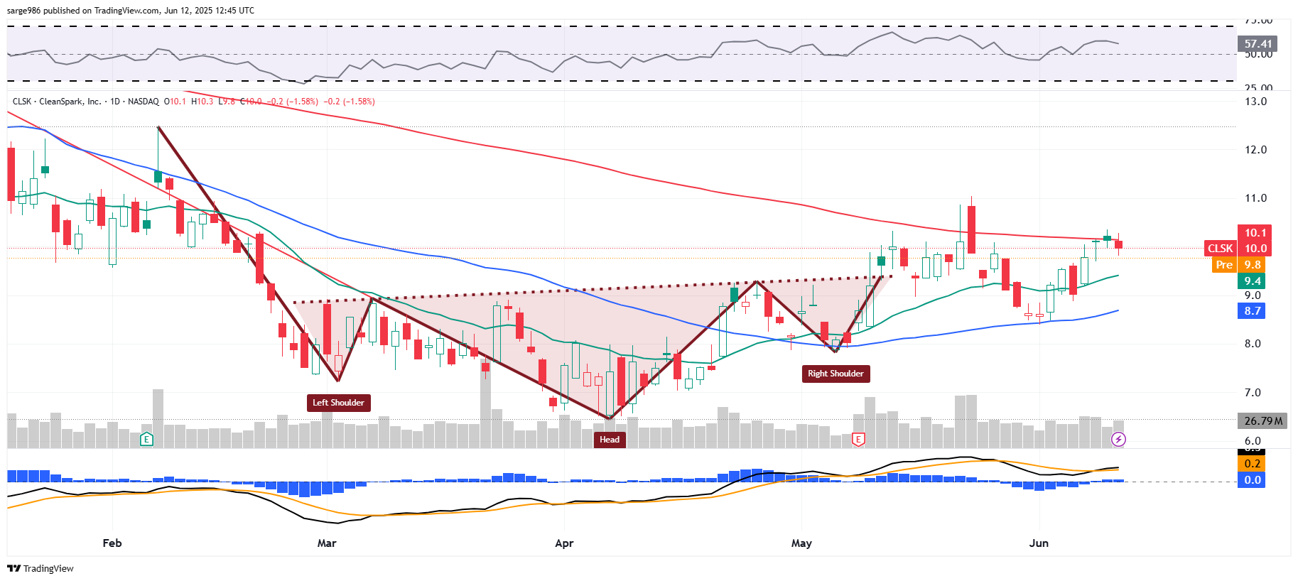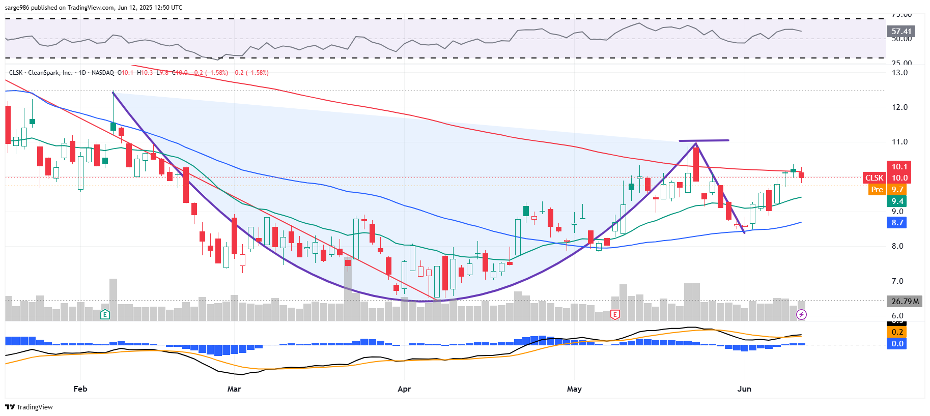 The shares appear to be rallying out of an inverted head and shoulders pattern (bullish) with a $9.40 pivot. CLSK had since found support at its own 50-day SMA on three consecutive trading sessions and now will again try to take on its 200-day SMA. New upside pivot of an even $10. With a suddenly bullish looking daily MACD and a reading for relative strength that's better than neutral, I could make an argument for a short-term target price in between $12.50 and $13. Now, look at this: