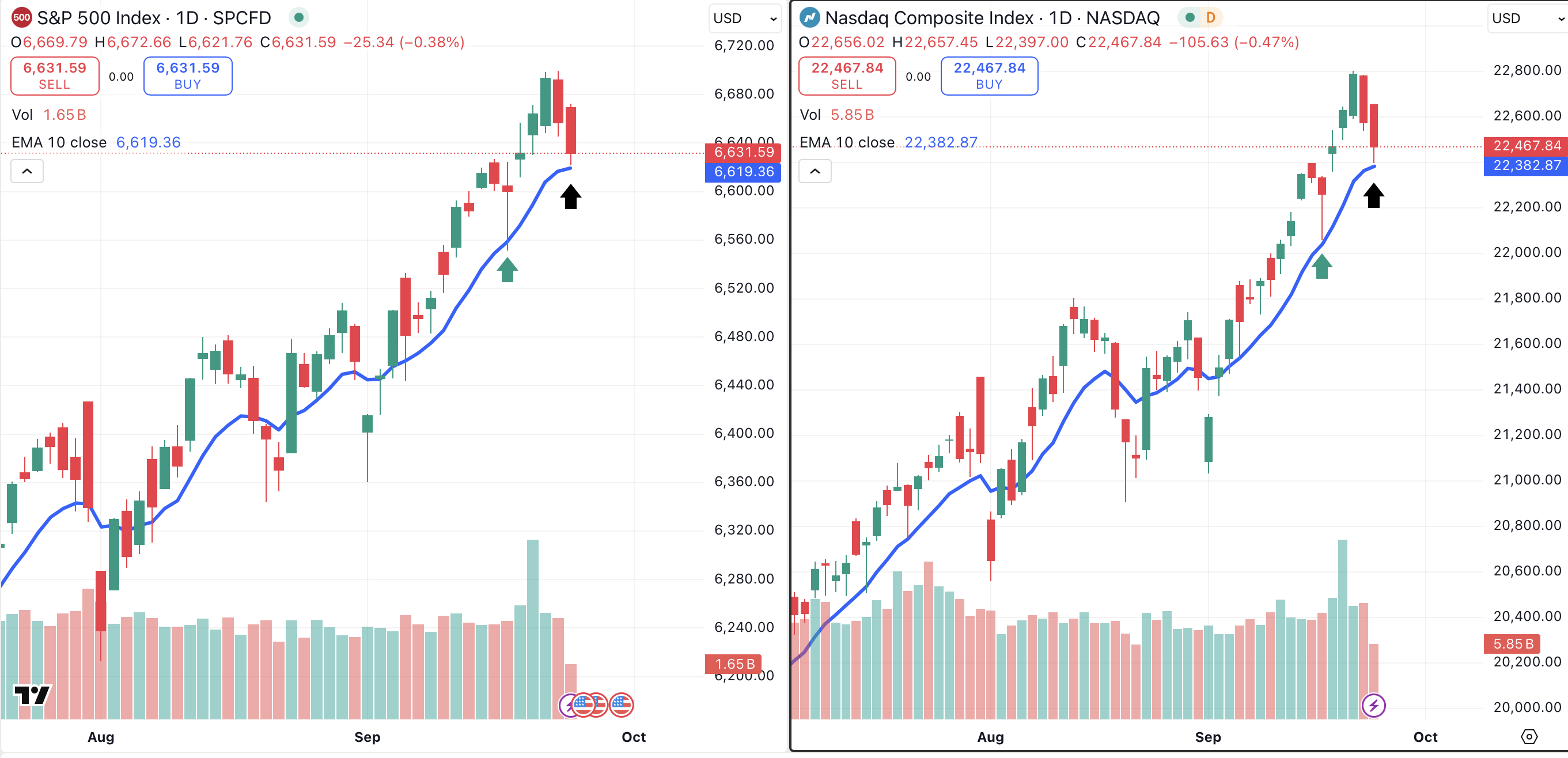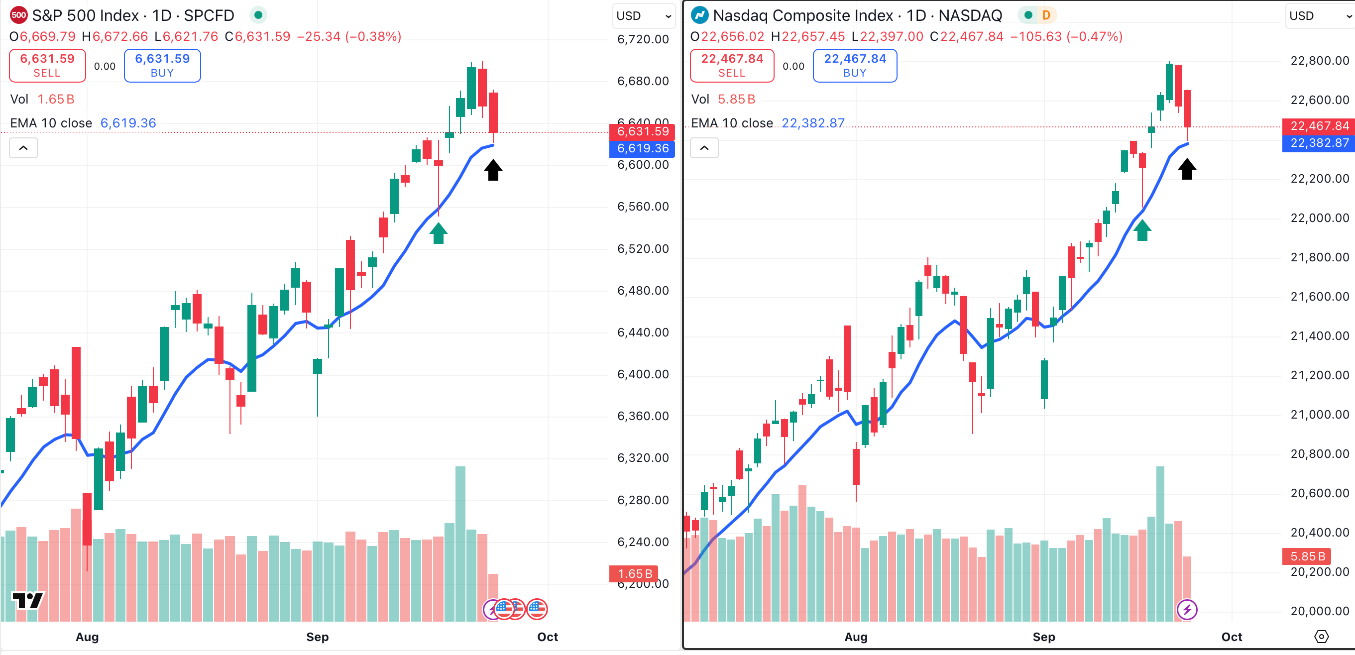 On Wednesday, the two-day pullback caused two major stock indexes to nearly reach their respective 10-day exponential moving average (EMA, blue). The S&P 500 (left chart, below) and the Nasdaq Composite (right chart, below) bounced (black arrows) when that indicator came into view. Both indexes also bounced when they encountered that indicator on September 17 (green arrows).