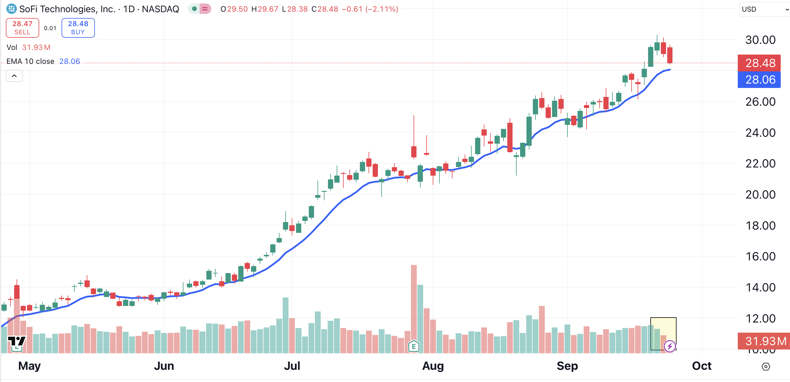 This is what some traders refer to as an "orderly pullback." If SoFi falls to about $28, the location of its 10-day EMA (blue), it would create a nice entry point.