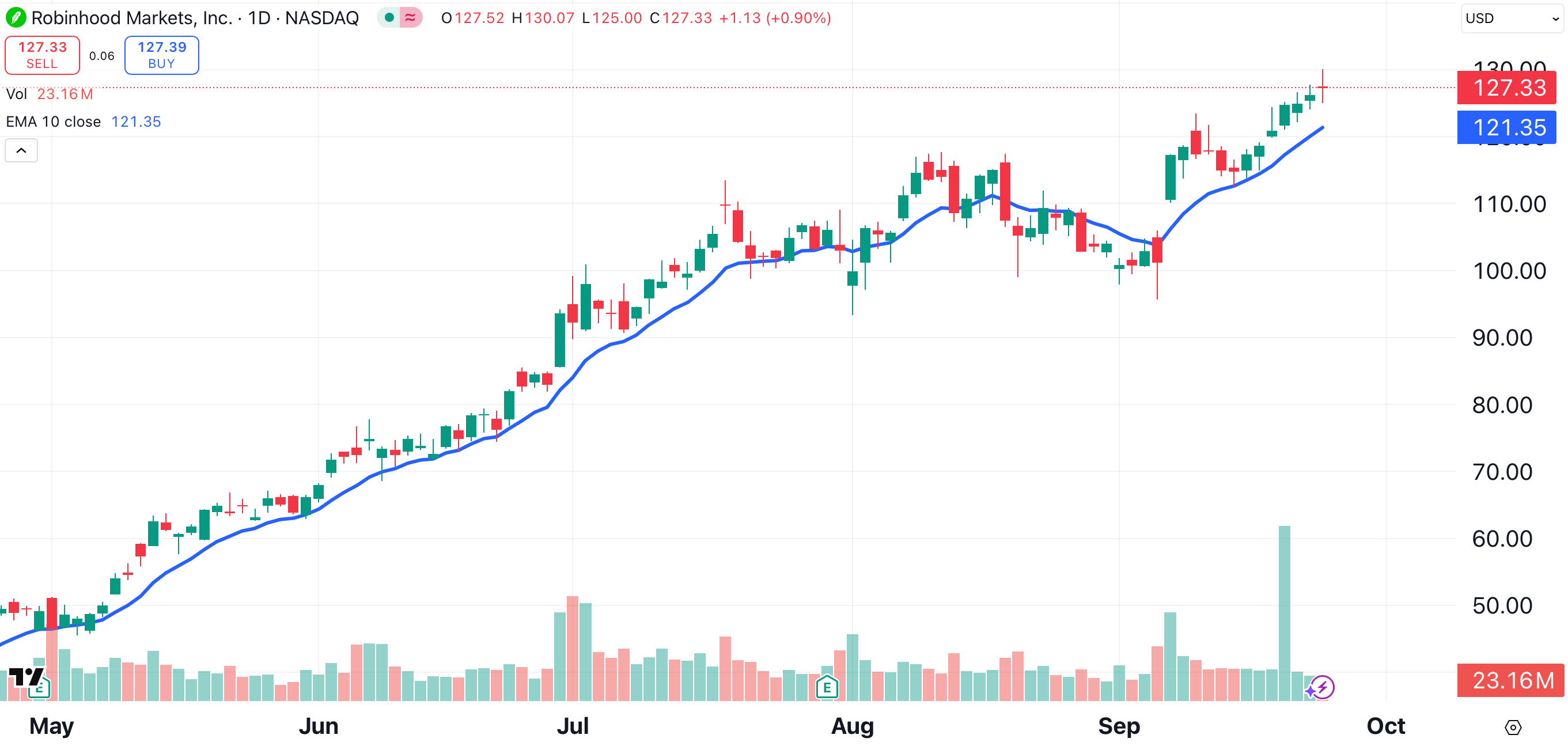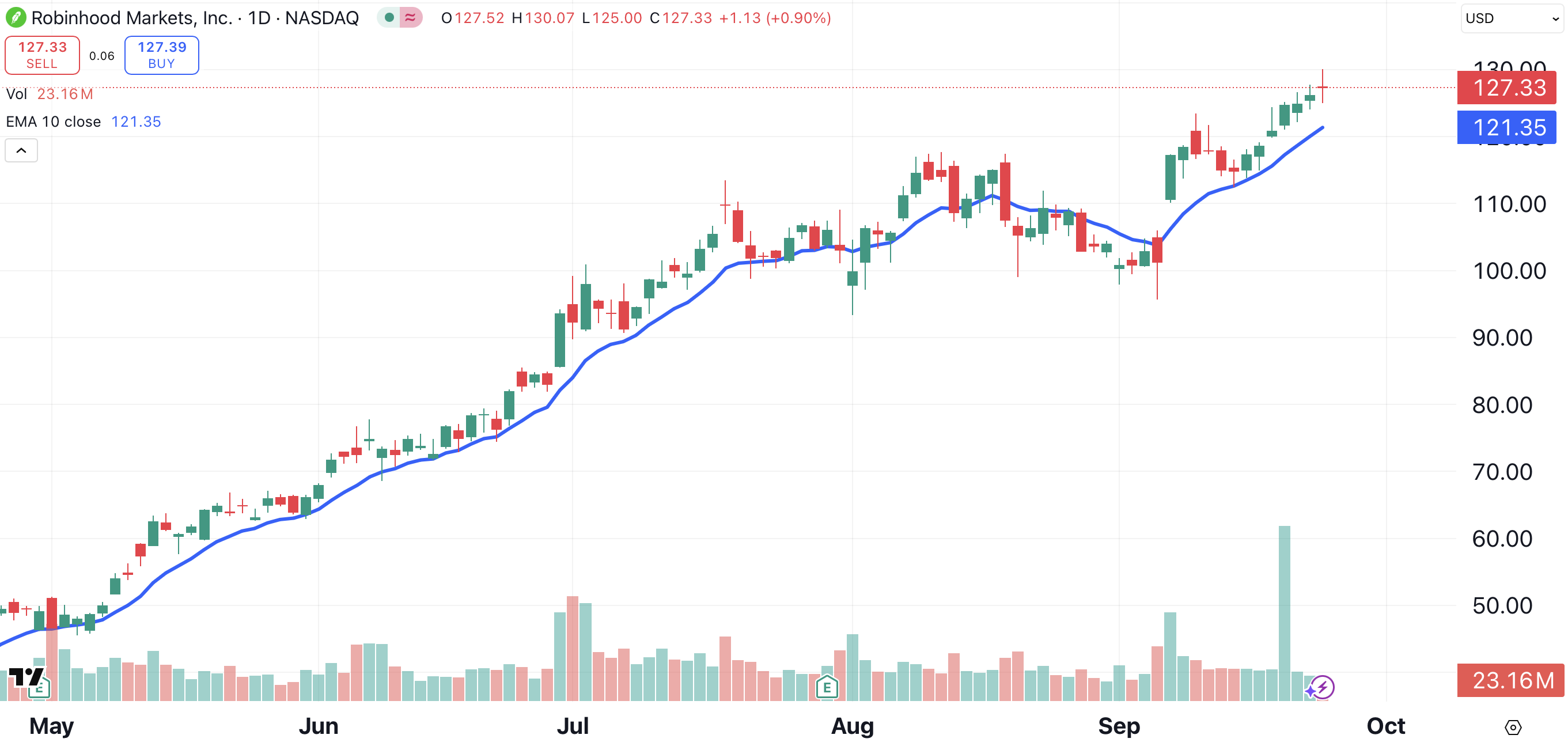 Pullback? What pullback? Apparently, Robinhood (HOOD ) didn’t get the memo. The Menlo Park, California-based retail brokerage closed at yet another all-time high on Wednesday.